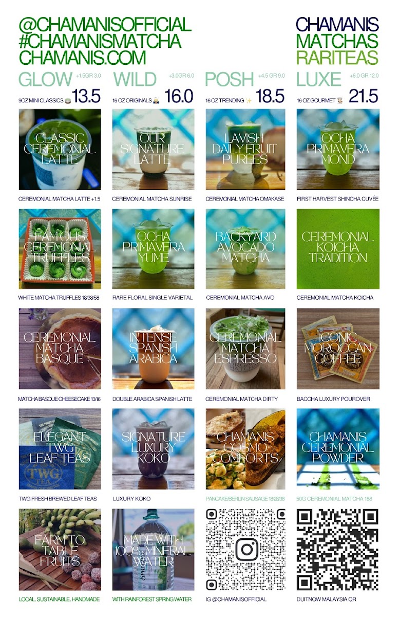 For matcha lovers, the Chamanis Luxury Kyushu Matcha is a must-try. The 9 OZ SINGLE SHOT offers a delicate blend of fresh eco milk and rich 100% Arabica espresso roasted in Italy, creating a balanced drink that’s both satisfying and indulgent, priced at MYR 13.00. If you’re looking for something extraordinary, the 16 OZ WILD MATCHA LEVEL is truly a gem. Combining backyard avocados and luscious single-cultivar volcano matcha from Kyushu, Japan, this drink is a matcha lover's dream—bamboo whisked to perfection and served iced for MYR 25.00.